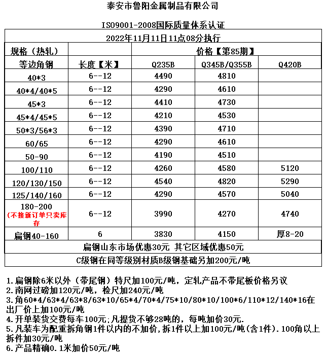 11月16日马钢对型钢产品销售指导价统一上涨30