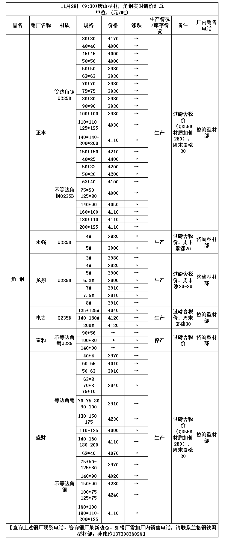 11月28日(9:30)唐山型材厂角钢实时调价汇总