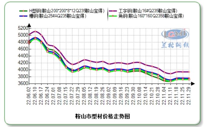 据兰格钢铁网调研数据数据显示:今日鞍山市场16#工字钢价格为3940元;25#A槽钢价格为3760元;160*160角钢价格为3720元;200×200H型钢价格为3730元。