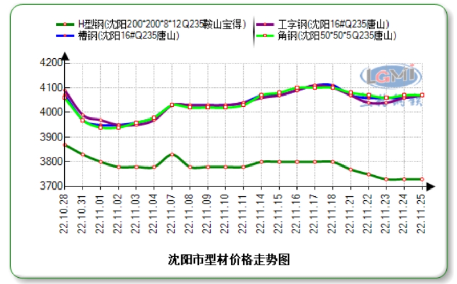 截至11月30日,沈阳地区16#唐山资源工字钢价格为4110元,较上月同期涨120元;16#唐山资源槽钢价格为4110元,较上月同期涨140元,5#唐山资源角钢价格为4120元,较上月同期涨150元;200*200鞍山宝得资源H型钢价格为3750元,较上月同期降80元。