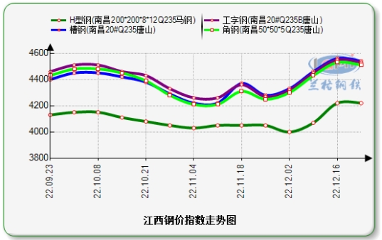 据兰格云商平台监测数据显示:截至12月19日,江西市场20#工字钢价格为4530元(吨价,下同),较上一工作日价格下跌20元/吨;20#槽钢价格为4540元,较上一工作日价格下跌20元/吨;5#角钢价格为4510元,较上一工作日价格下跌20元/吨;200×200H型钢价格为4220元,较上一工作日价格持稳。