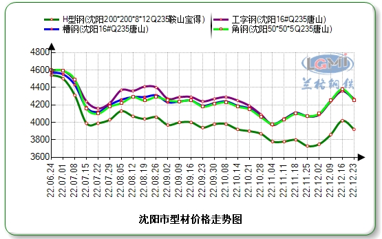 据兰格钢铁网调研数据数据显示:今日沈阳市场16#工字钢价格为4270元,较上周同期降90元;16#槽钢价格为4260元,较上周同期降100元;5#角钢价格为4250元,较上周同期降130元;200×200H型钢价格为3920元,较上周同期降100元。