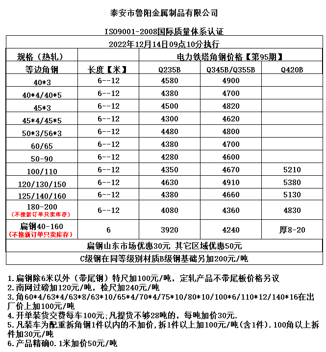 12月30日(9:30)唐山型材厂角钢实时调价汇总