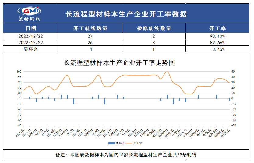 兰格调研:截至12月29日15:00,兰格钢铁网统计国内15家长流程样本生产企业共29条型钢轧线,在产26条,停产3条,与上周同期(12月22日)相比降3.45%,开工率为89.66%,开工率较上周略有下滑。