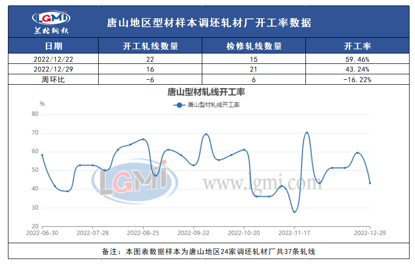 兰格钢铁网统计唐山24家样本轧钢企业共37条轧线,在产16条,停产21条,较上周增加6条,开工率为43.24%,受限于成本高企、成交清淡厂家生产积极性受挫,开工有所回落。