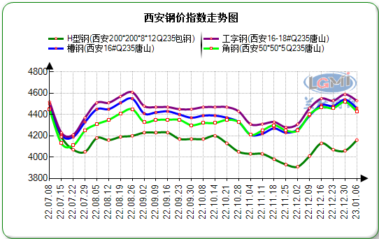 本周(12月30日-1月6日)西安市场工槽角价格周初趋弱后主稳,价格调降空间60-90元区间,H型钢商户按市场实际需求价格调整,周初趋强后主稳,价格调涨空间100元区间。周前期期螺盘面走弱,但现货市场仍有补货预期释放部分库存后动力减弱,市场休市氛围明显,大户商家盘点库存做放假准备。宏观利好重磅消息对购买首套房大力支持,下调贷款利率政策下线,对市场形成支撑。钢厂方面,唐山调坯轧材厂出厂成品材价格仍维持窄幅调整,市场补货动力也有所降低。最新调查,长流程企业开工率82.76%,较上周小幅下滑。调坯轧材厂开工率43.24%,开工率较上周持平。预计下周市场价格多稳个调为主。
