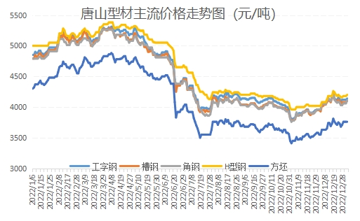 自十一月份初至十二月底唐山型材市场价格呈现修复性止跌反弹行情,原料成本表现坚挺、季节性赶工需求明显释放,以及在稳增长政策落地夯实的强预期共振下,市场信心显著提高。伴随防疫政策趋向宽松,加之外部美联储加息步伐放缓,给予市场一定调整期,叠加国内利好信号释放,黑色系盘面强势上扬,场内情绪暖意洋洋,市场预期得以修复,情绪面有所好转,带动现货市场入市积极性大幅度提高,型材价格逐步止跌反弹。