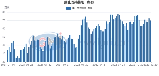 据兰格钢铁云商平台监测数据显示,截止2022年12月29日,唐山型材调坯企业成品材库存量约为70万吨,其中在6月份7月份10月份12月份库存量普遍高达70-80万吨,厂库维持较高水平,唐山型材调坯企业成品材库存持续累库,较去年同期增加约30万吨;据小编了解到市场冬储操作较少,加之今年春节假期较早,部分商户有提前休市计划,多有降低库存操作,因此厂库呈现累库压力。