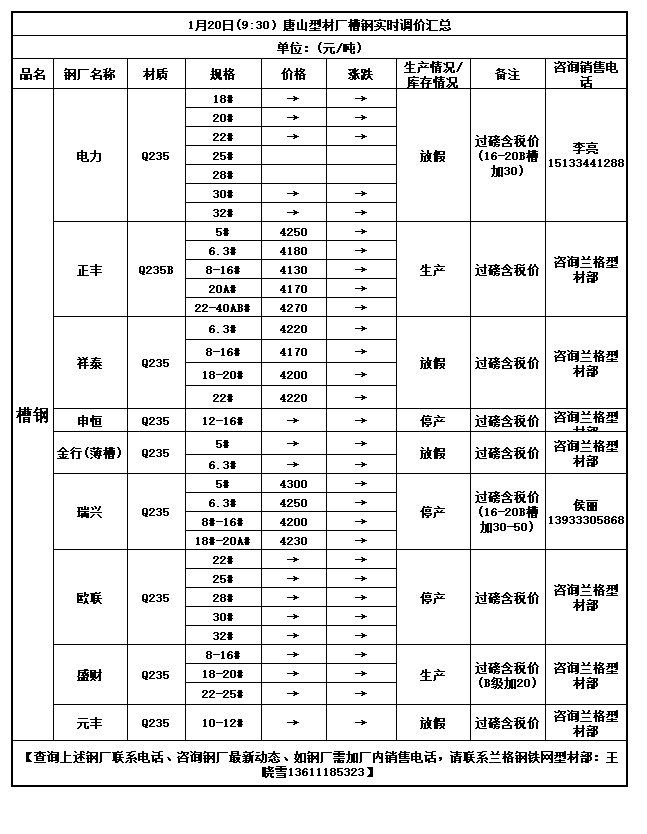 1月20日(9:30)唐山型材厂槽钢实时调价汇总