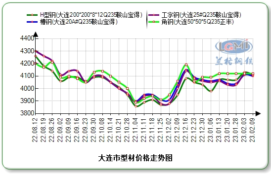 据兰格云商平台监测数据显示:今日大连市场25#工字钢价格为4110元;20A#槽钢价格为4100元;5#角钢价格为4120元;200×200H型钢价格为4110元。