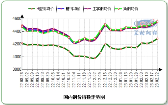 截至2月22日,国内市场25#工字钢平均价格为4538元,较上一工作日统计价格涨23元;25#槽钢平均价格为4607元,较上一个工作日统计价格涨24元;5#角钢均价为4472元,较上一个工作日统计价格涨22元;200×200H型钢平均价格为4180元,较上一个工作日统计价格涨19元。