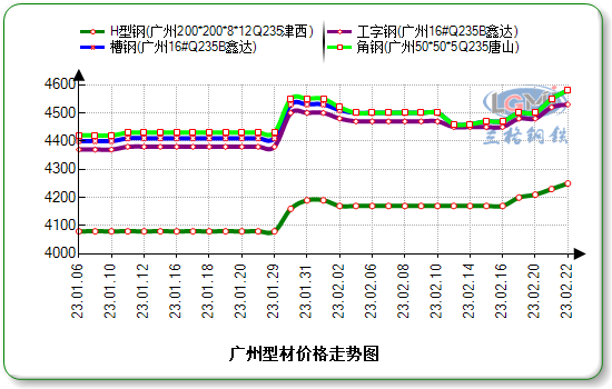 据兰格云商平台监测数据显示:今日广州市场鑫达产16#工字钢价格为4530元,涨10元;唐山产16#槽钢价格为4580元,涨30元;唐山产5#角钢价格为4580元,涨30元;津西产200×200H型钢价格为4250元,涨20元。