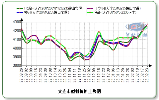 2月23日大连型材市场价格主稳个涨,市场按需采购为主,成交一般。从上游供应角度看,晨初鞍山宝得价格持稳,盘中迁安普碳方坯价格上涨20元,厂家补涨传递至市场,部分钢贸商价格窄幅上行。从市场角度看,目前大连周边地区工地启动较少,叠加价格不断攀升,下游采购趋向谨慎,今日刚需成交为主,出货一般。午后鞍山宝得钢材价格持稳,最低钢材价格为4020元,尾盘唐山普方坯价格涨20元,执行3790元含税出厂,预计明日大连型材价格稳中趋强运行。