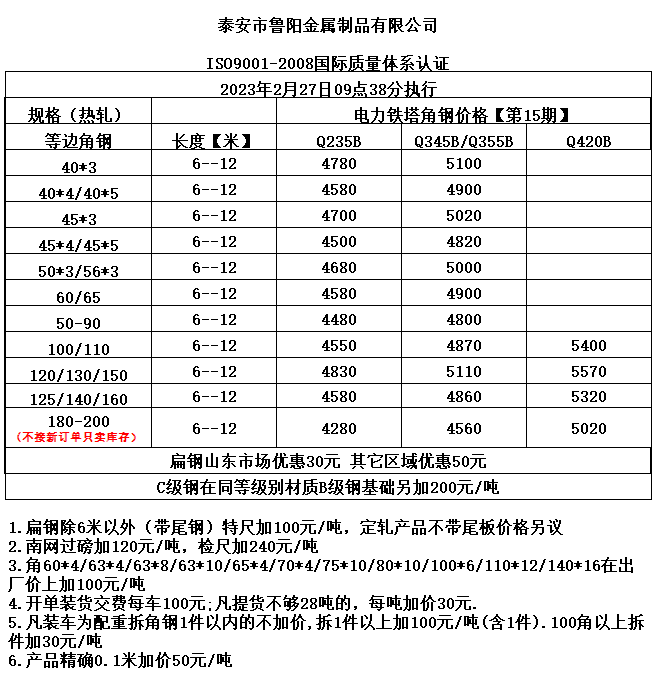 2月27日(09:30)唐山型材厂角钢实时调价汇总