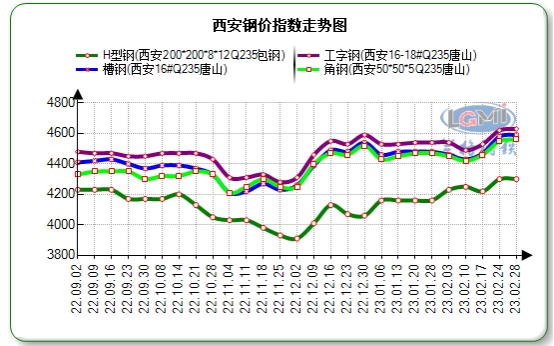 H型钢价格震荡弱调后反弹。终端工程需求尚未全面恢复,商户放量较为有限,大户常备库存居高商户采取薄利回笼资金操作,价格适当小幅弱调后修复性反弹。钢厂价格随着上游原料成本支撑下跌空间有限,现货市场个别呈现倒挂无利润。进入3月份商户普遍看好金三银四旺季预期,现货市场现阶段成交向好,市场价格不易盲目弱调。但仍需合理管控库存,预期价格持续拉高,恐高心态影响终端跟进乏力,市场价格窄幅适当高位整理。截至2月28日,西安200*200H型钢均价4300元(吨价,下同),较上月同期涨140元区间。预期多关注整体需求跟进程度,多持谨慎观望态势为主。