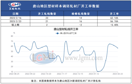 从长流程钢厂开工情况来看,截止02月23日,国内15家长流程样本生产企业开工率为86.29%,较上月平均84.94%窄幅上扬1.35%,长流程钢厂供应较为稳定。唐山24家样本轧钢企业平均开工率为54.05%,较上月平均25.23%大幅上升28.82%,唐山轧钢企业利润逐渐恢复,下游需求也逐渐好转,开工率大幅回升。