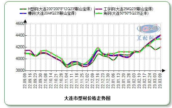 3月9日大连型材市场价格区间调整,随着期螺拉涨下游部分入场采购,成交略有回暖。从价格角度看,鞍山宝得价格持稳,唐山地区轧材企业型材出厂价格降10-20元,午后唐山轧钢企业型材价格受需求拉动有所上行,当地部分企业跟随上游厂家调整。从市场角度看,前期市场观望情绪持续了一段时间,今天午后期螺大涨刺激终端,采购需求略有释放,成交回暖。午后鞍山宝得钢材价格持稳,最低钢材价格为4160元,日间普碳方坯价格涨40元,执行4010元含税出厂,预计明日大连型材价格稳中趋强运行。