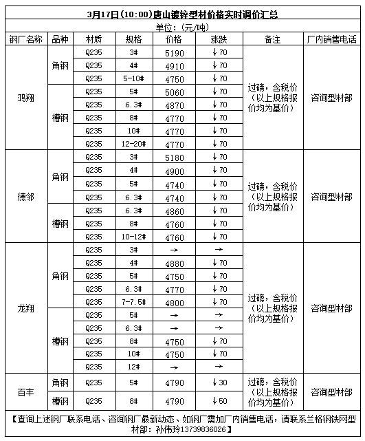 3月17日(09:30)唐山型材厂槽钢实时调价汇总