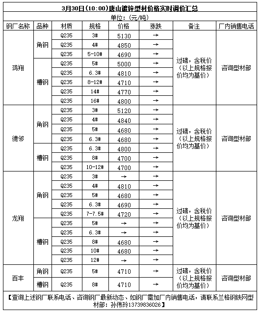 3月30日(09:30)唐山型材厂角钢实时调价汇总