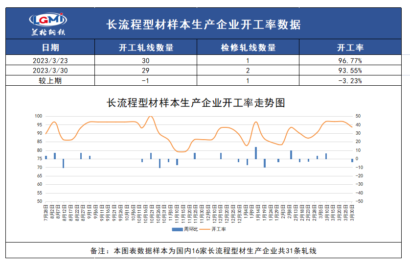兰格调研:截至3月30日15:00,兰格钢铁网统计国内16家长流程样本生产企业共31条型钢轧线,在产29条,停产2条,停产轧线数较上期统计(3月23日)增加1条,开工率为93.55%,个别生产轧线处检修状态,开工小幅回落。