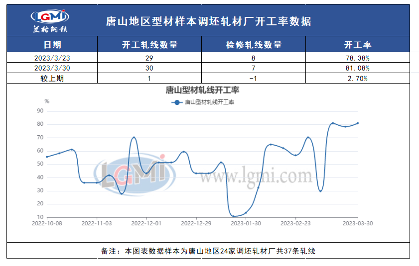 兰格钢铁网统计唐山24家样本轧钢企业共37条轧线,在产30条,停产7条,停产轧线数较上期统计减少1条,开工率为81.08%,本周厂家出货量可观,生产积极性较高,开工率在偏高基础上仍有小幅上涨。