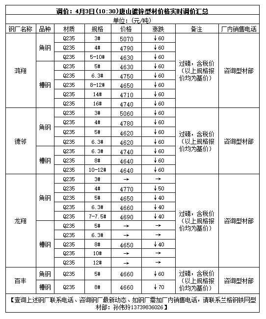 调价:4月3日(10:30)唐山镀锌型材价格实时调价汇总