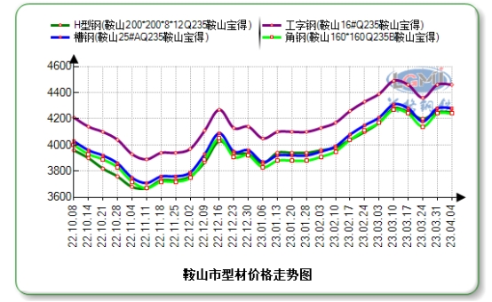 据兰格钢铁网调研数据数据显示:今日鞍山市场16#工字钢价格为4460元;25#A槽钢价格为4280元;160*160角钢价格为4240元;200×200H型钢价格为4250元。