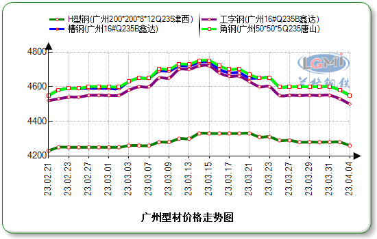 据兰格云商平台监测数据显示:今日广州市场鑫达产16#工字钢价格为4500元,跌30元;唐山产16#槽钢价格为4550元,跌30元;唐山产5#角钢价格为4550元,跌30元;津西产200×200H型钢价格为4260元,跌20元。