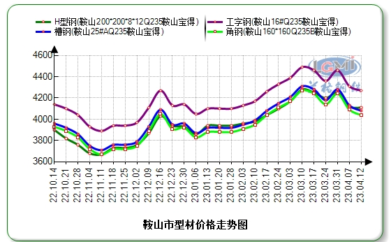 据兰格钢铁网调研数据数据显示:今日鞍山市场16#工字钢价格为4270元;25#A槽钢价格为4080元;160*160角钢价格为4040元;200×200H型钢价格为4110元。