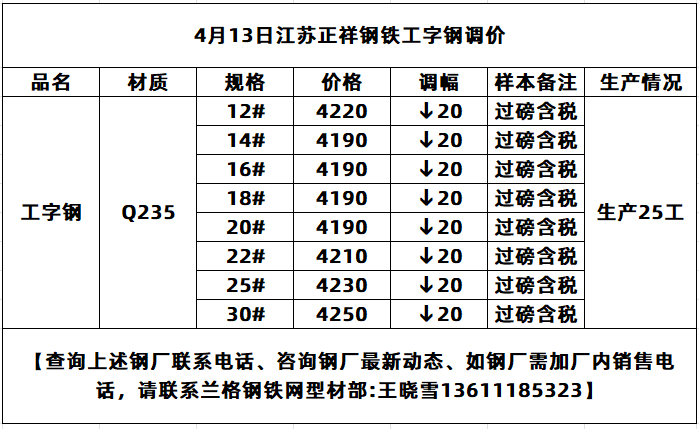 4月13日唐山瑞兴/瑞隆钢厂槽钢调价