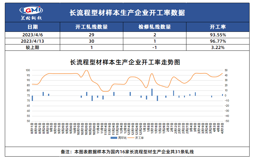 兰格调研:截至4月13日15:00,兰格钢铁网统计国内16家长流程样本生产企业共31条型钢轧线,在产30条,停产1条,停产轧线数较上期统计(4月6日)减少一条,开工率为96.77%,部分轧线结束检修开始生产,开工率窄幅回升。