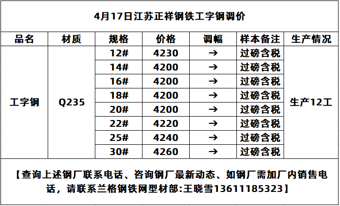 4月17日山西晋南钢铁型钢挂牌价格稳