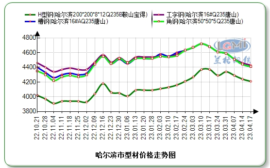 据兰格云商平台监测数据显示:今日哈尔滨市场16#工字钢价格为4430元;16#A槽钢价格为4410元;5#角钢价格为4410元;200×200H型钢价格为4210元(国标检尺价格)。