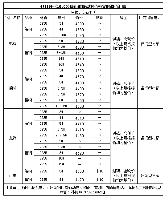 4月19日(09:30)唐山型材厂角钢实时调价汇总
