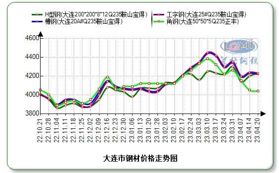 据兰格云商平台监测数据显示:今日大连市场25#工字钢价格为4230元;20A#槽钢价格为4220元;5#角钢价格为4040元;200×200H型钢价格为4230元。