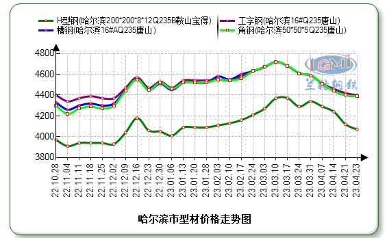据兰格云商平台监测数据显示:今日哈尔滨市场16#工字钢价格为4400元;16#A槽钢价格为4390元;5#角钢价格为4390元;200×200H型钢价格为4070元(国标检尺价格)。