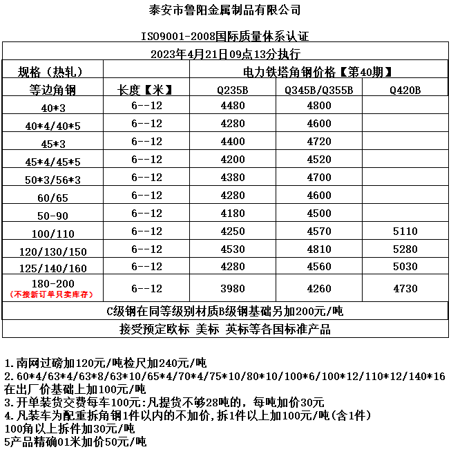 4月23日(09:30)唐山型材厂角钢实时调价汇总