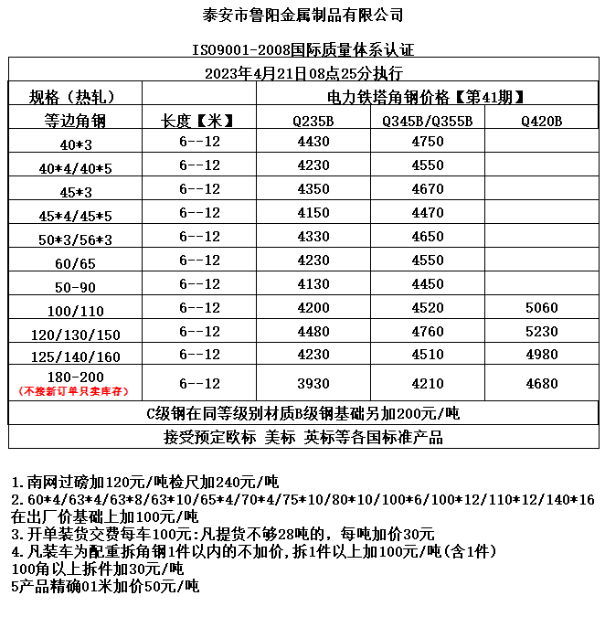 4月23日(09:30)唐山型材厂角钢实时调价汇总