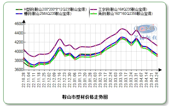 据兰格钢铁网调研数据数据显示:今日鞍山市场16#工字钢价格为4130元;25#A槽钢价格为3940元;160*160角钢价格为3900元;200×200H型钢价格为3940元。
