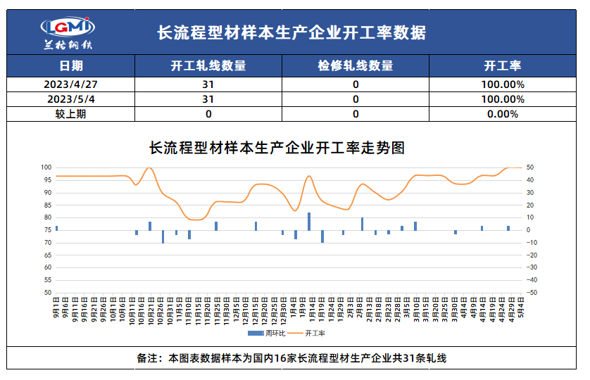 兰格调研:截至5月4日15:30,兰格钢铁网统计国内16家长流程样本生产企业共31条型钢轧线,在产31条,停产0条,停产轧线数较上期统计(4月27日)持平,开工率为100%,长流程样本生产企业目前均正常生产,开工率仍处高位。