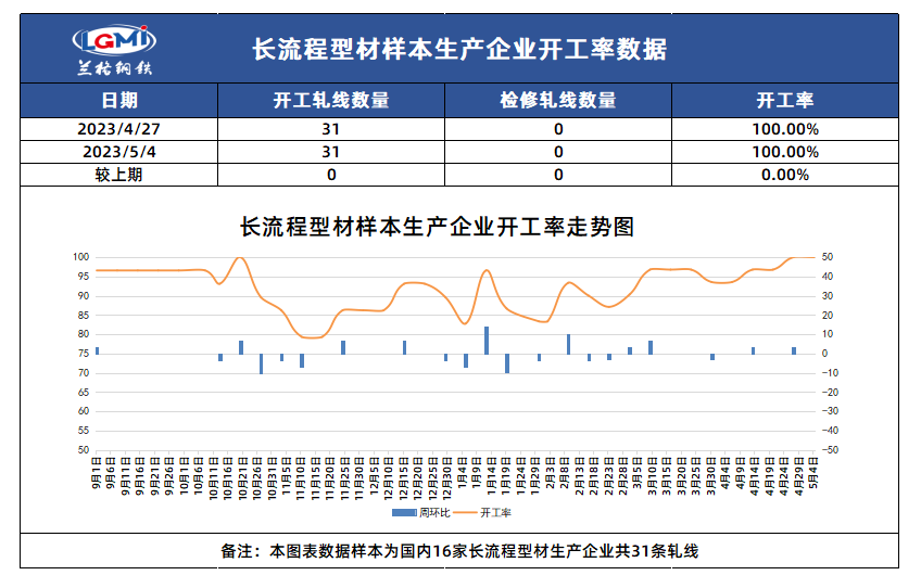 五月份市场开局不利,从上游生产角度看,铁矿石、双焦仍然继续走弱,四月末期现市场短暂震荡后并未企稳,而是开启了新一轮下跌行情,至本周五企稳反弹,截至发稿,长流程生产企业型材出厂价格较节前累降90-130元,唐山轧钢企业型材出厂价格较节前累降120-150元。据兰格钢铁网调研数据显示,目前长流程型材样本生产企业开工率为100%,唐山地区轧钢企业库存累积至高位,前期钢厂减产、供应收缩的预期并未兑现,这也是拖拽期现市场双双下行的主要因素,至本周五期螺超跌后技术性反弹,现货市场交投情绪略有缓和,厂家出货好转,对成材价格存在一定支撑。