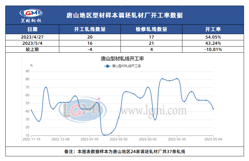兰格钢铁网统计唐山24家样本轧钢企业共37条轧线,在产16条,停产21条,停产轧线数较上期统计增加4条,开工率为43.24%,较上期统计降10.81%,当地样本轧钢企业近期出货不畅,库存仍有所升高,生产积极性偏低。