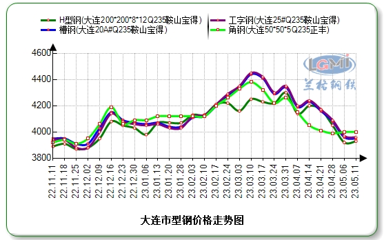 据兰格云商平台监测数据显示:今日大连市场25#工字钢价格为4090元;20A#槽钢价格为4080元;5#角钢价格为3960元;200×200H型钢价格为4050元。