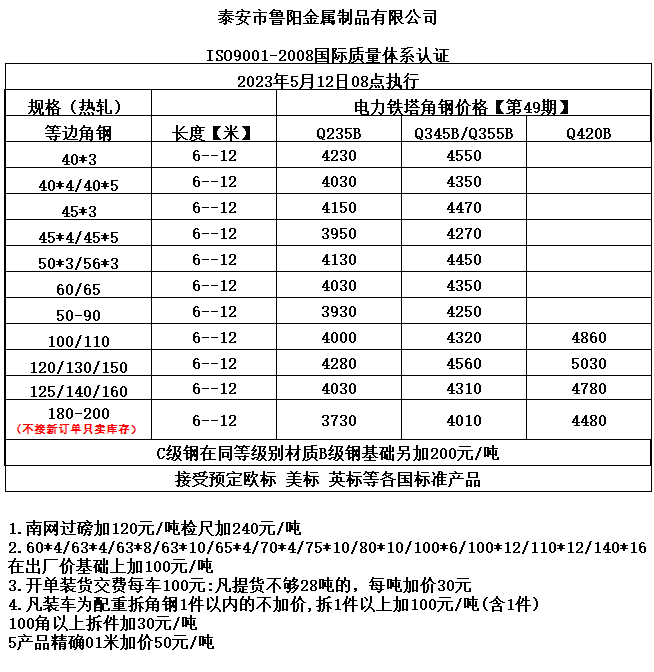 • 5月12日(09:30)唐山型材厂角钢实时调价汇总
