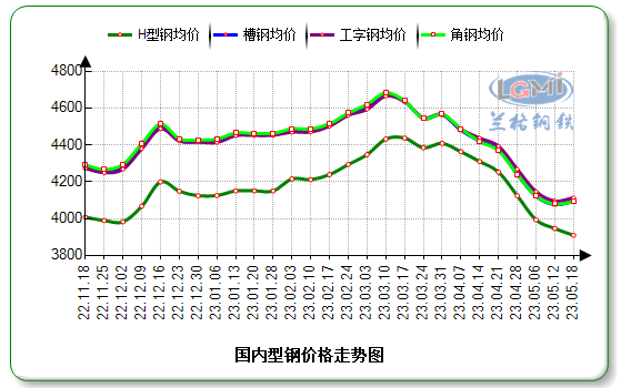 截至5月18日,国内市场25#工字钢平均价格为4092元,较上一工作日统计价格涨13元;25#槽钢平均价格为4101元,较上一个工作日统计价格涨12元;5#角钢均价为4027元,较上一个工作日统计价格涨12元;200×200H型钢平均价格为3800元,较上一个工作日统计价格涨2元。