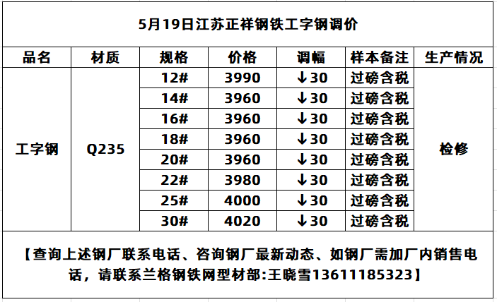 • 5月19日唐山正丰钢厂槽钢调价信息
