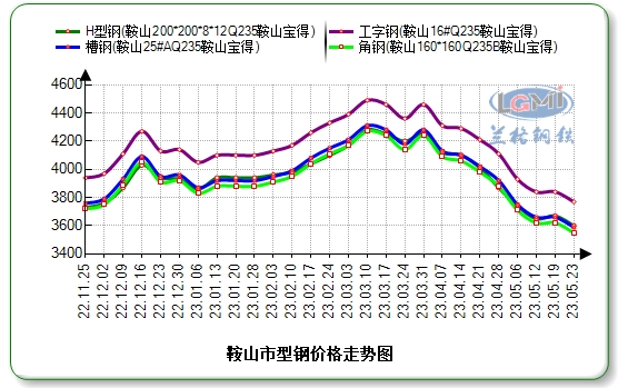 据兰格钢铁网调研数据数据显示:今日鞍山市场16#工字钢价格为3880元;25#A槽钢价格为3700元;160*160角钢价格为3660元;200×200H型钢价格为3690元。