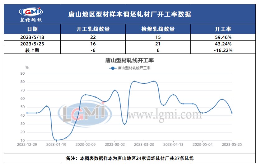 兰格钢铁网统计唐山24家样本轧钢企业共37条轧线,在产16条,停产21条,停产轧线数较上期统计增加6条,开工率为43.24%,较上期统计降16.22%,前期轧钢厂库存处于偏高水平,叠加本周出货不畅,厂家生产积极性不佳,开工率明显回落。