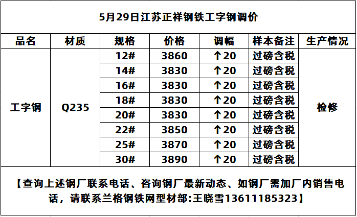 • 5月29日唐山正丰钢厂槽钢调价信息