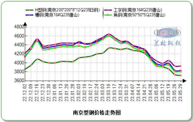 南京市场为例,5#角报价3810,较上一交易日价格持稳,16#槽报价3830,较上一交易日价格持稳,16#工字钢报价3930,较上一交易日价格持稳,H200*200报价3720,较上一交易日价格持稳。(以上报价工角槽为过磅含税价格,H型钢为国标检尺价格)